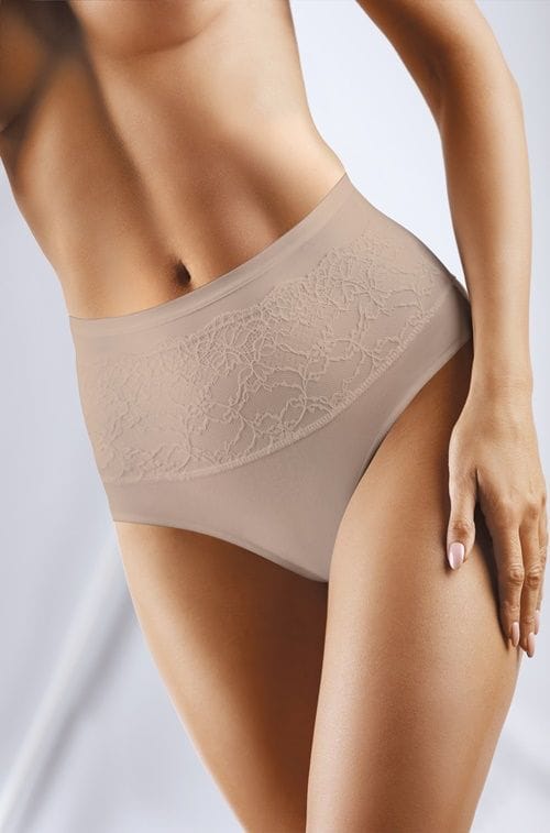 Eleganckie, wyższe w pasie figi, które lekko modelują linię brzuszka i bioder (dzięki zastosowaniu odpowiedniej tkaniny i płaskiej taśmy u góry). Wykończone koronką, wyglądają wspaniale. Skład: 87% poliamid, 13% elastan.