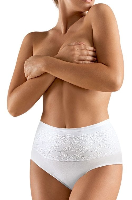 Eleganckie, wyższe w pasie figi, które lekko modelują linię brzuszka i bioder (dzięki zastosowaniu odpowiedniej tkaniny i płaskiej taśmy u góry). Wykończone koronką, wyglądają wspaniale. Skład: 87% poliamid, 13% elastan.
