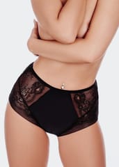Figi damskie wysokie z zabudowanymi biodrami z płaską gumką w talii. Biodra i nogawki z efektownej koronki, płasko zakończonej. Skład: 80% poliamid, 20% elastan.