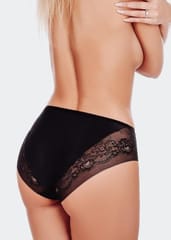 Figi damskie o klasycznym kroju. Biodra i nogawki z efektownej koronki, płasko zakończonej, w talii płaska gumka. Skład: 80% poliamid, 20% elastan.