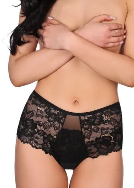 Figi damskie wykonane efektownej koronki o kwiatowym motywie. W pasie płaska gumka. Tył z podwójnej siateczki. Skład: 85% poliamid, 15% elastan.
