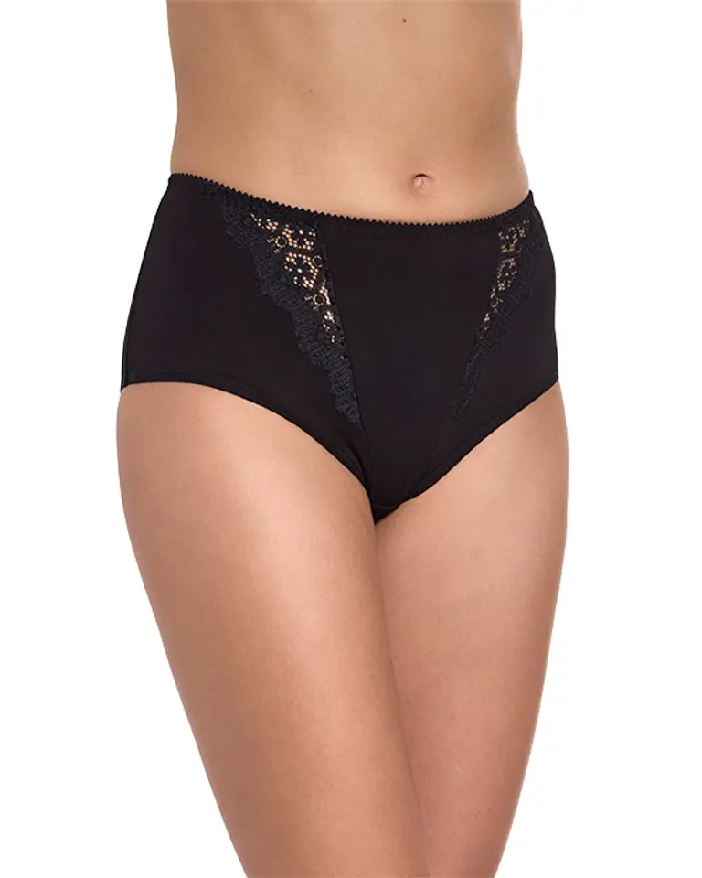 Figi damskie o klasycznym kroju, boki zabudowane, przód ozdobiony wstawką z koronki o kwiatowym motywie. Skład: 95% bawełna, 5% elastan.