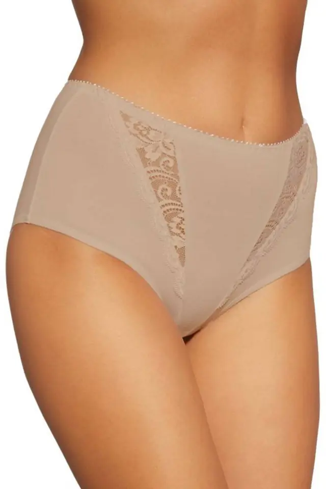 Figi damskie o klasycznym kroju, boki zabudowane, przód ozdobiony wstawką z koronki o kwiatowym motywie. Skład: 95% bawełna, 5% elastan.