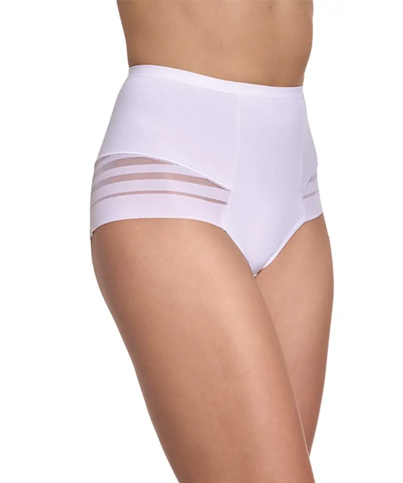 Figi damskie wykonane z gładkiej bawełny. Tył i biodra obszyte delikatną tkaniną w transparentne paski. Pas płasko wykończony. Skład: 95% bawełna, 5% elastan.