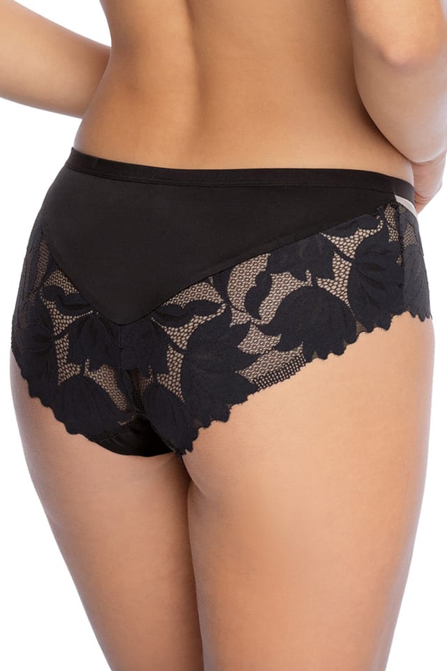 Klasyczne figi damskie pełny krój, lekko zabudowane boki. Z delikatnej koronki i mikrofibry. Skład: 76% poliamid, 19% elastan, 5% bawełna.