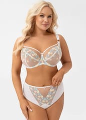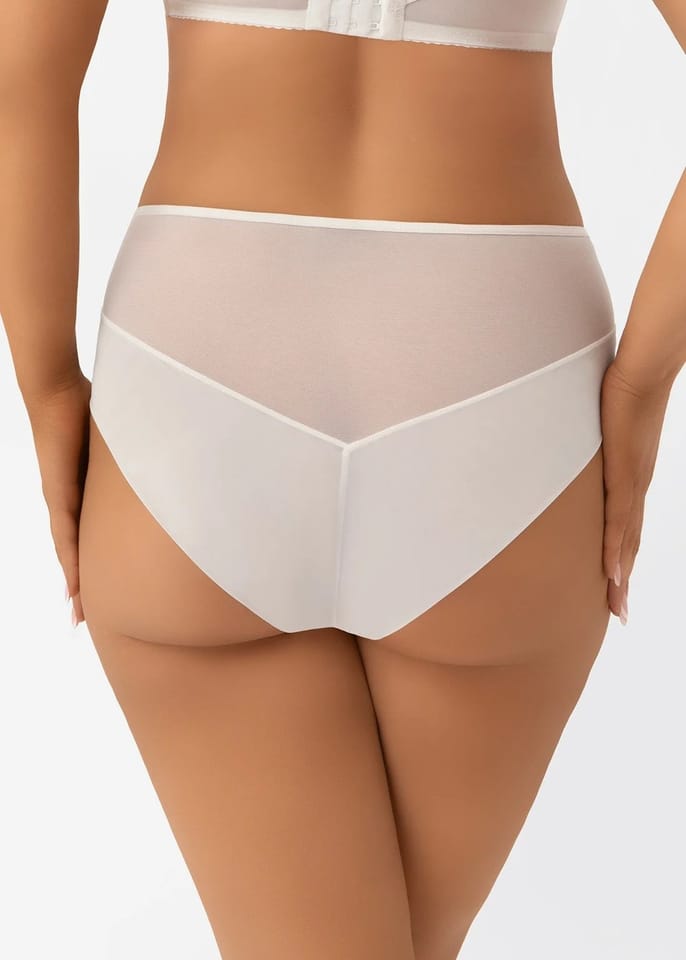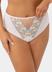 Figi wykonane z tiulu elastycznego, na przodzie wstawki z haftu podszytego tiulem stabilnym, wykończonym na gładko, tak aby majtki nie odznaczały się pod ubraniem. Fason zasłaniający prawie całe pośladki. Skład: 90% poliamid, 7% elastan, 3% poliester.