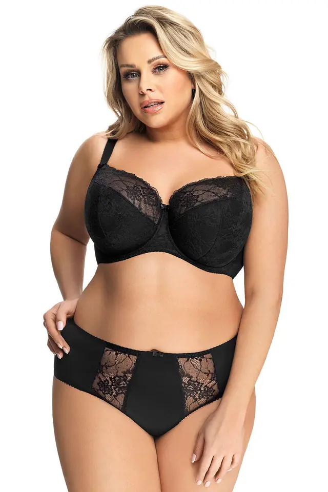 Klasyczne figi wykonane z gładkiej dzianiny. Na przodzie ozdobione dwoma wstawkami z koronki elastycznej. Nogawki wykończone ozdobną gumokoronką.
