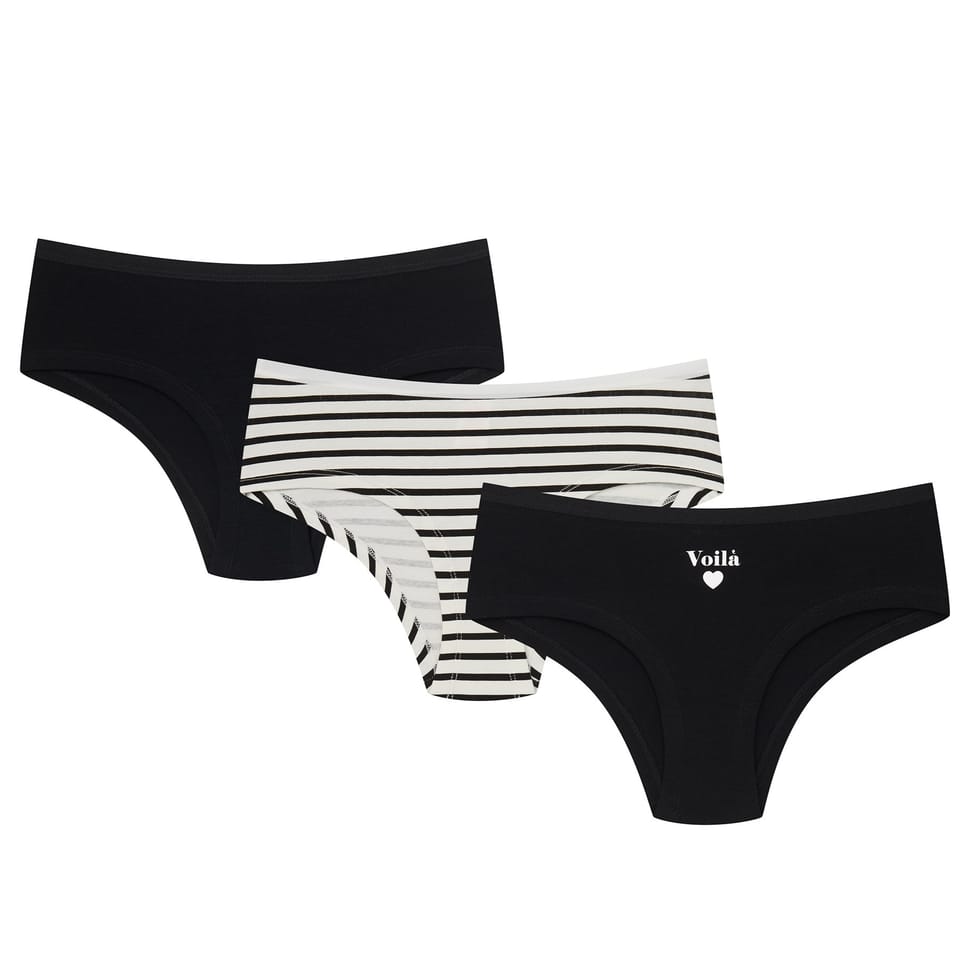 Figi damskie o kroju bikini, średni stan i średnio zabudowane boki. Płaska gumka w pasie. Wykonane z wysokiej jakości miękkiej dzianiny bardzo przyjemnej w dotyku. Pakowane po 3 sztuki. Skład: 95% bawełna, 5% elastan.