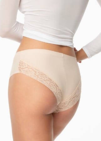 Figi damskie o klasycznym kroju i wykończeniem brzegów w technologii INVISIBLE_LINE i delikatną koronką. Tył z delikatnym wycięciem odsłaniającym pośladki. Skład: 89% poliamid, 10% elastan, 1% bawełna.