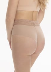 Figi damskie o kroju brazylian, jednolite, w pasie ozdobna, delikatna koronka. Laserowo cięte nogawki zapewniają niewidoczność pod ubraniem, odporne na rolowanie i strzępienie. Skład: 84% bawełna, 16% elastan.