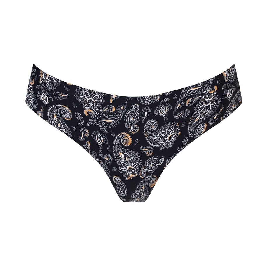 Figi damskie o kroju brazylian, ozdobione kolorowym wzorem. Laserowo cięte, bezszwowo zakończone. Pakowane w ozdobne pudełko. Skład: 89% poliamid, 10% elastan, 1% bawełna.