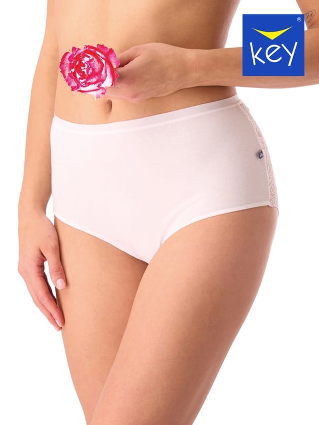Figi damskie o wysokości do pępka, w całości zakrywające pośladki. W pasie miękka gumka pokryta gęstym, wygodnym, bardzo rozciągliwym szwem. Tył fig ozdobiony kwiatową, rozciągliwą koronką. Skład: 95% bawełna, 5% elastan.