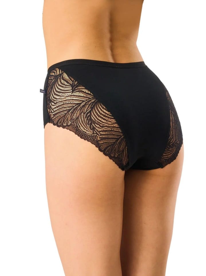 Figi damskie o wysokości do pępka, w całości zakrywające pośladki. W pasie miękka gumka pokryta gęstym, wygodnym, bardzo rozciągliwym szwem. Tył fig ozdobiony kwiatową, rozciągliwą koronką. Skład: 95% bawełna, 5% elastan.