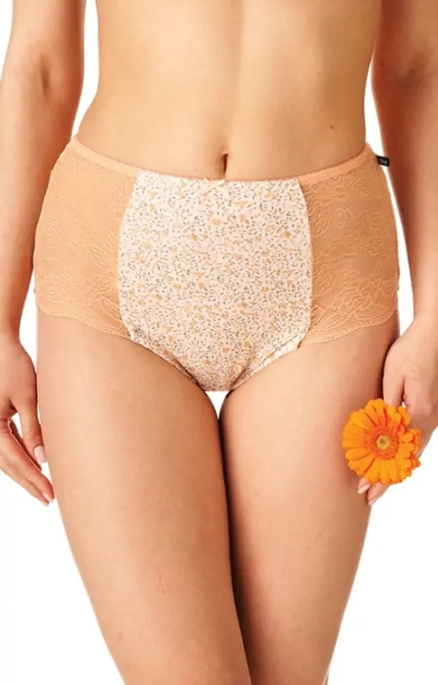Figi damskie z wysokim stanem i szerokim bokiem. Figi ze wstawkami z miękkiej koronki o kwiatowym motywie. W pełni zakrywają pośladki. W opakowaniu 2 szt.Skład: 95% bawełna, 5% elastan, koronka:90% poliamid, 10% elastan.