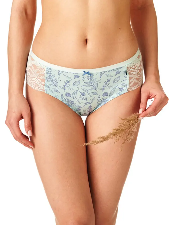 Majtki damskie typu mini bikini. Wykonane z miękkiej bawelny, na biodrach koronkowe wstawki.Skład: 95% bawełna, 5% elastan.
