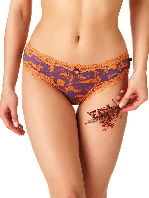 Figi damskie typu bikini, o niskim kroju i szerokim boku. Wykonane ze wzorzystej bawełny. Skład: 95% bawełna, 5% elastan