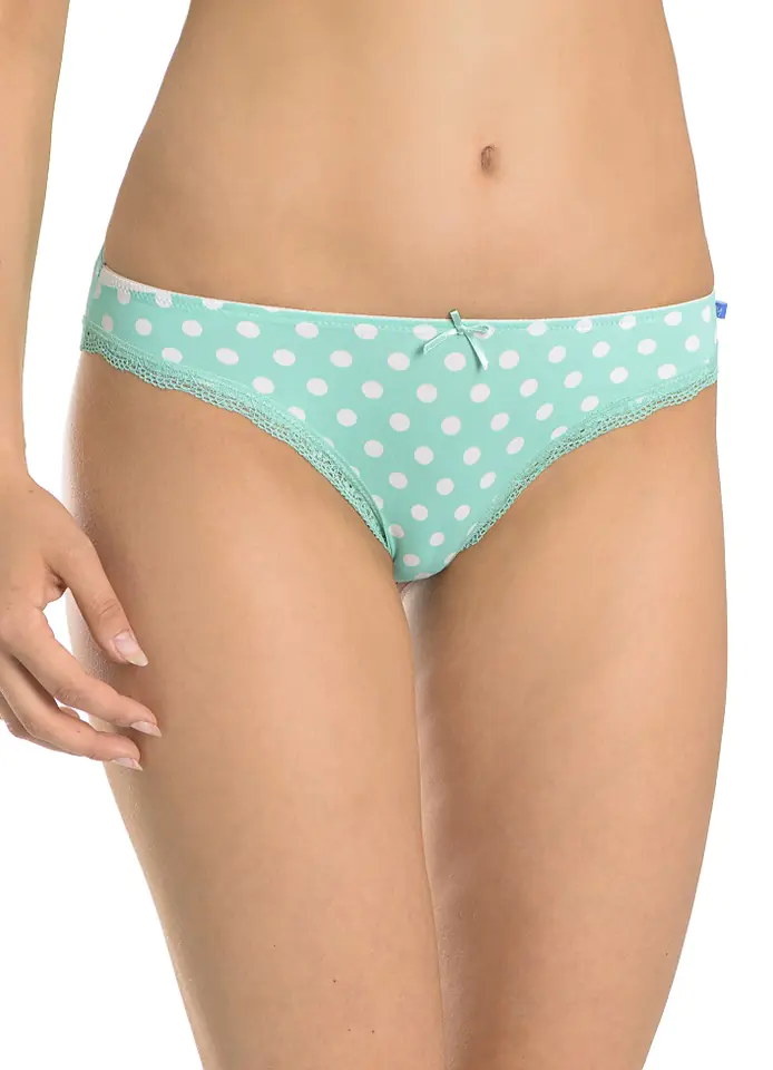 Figi damskie o kroju mini bikini (niski stan, wąskie boki). Uszyte z mięciutkiej, przyjemnej dla skóry dzianiny. Nogawki obszyte delikatną koronką. Pakowane po dwie sztuki (niebieskie w paski i zielone w grochy).