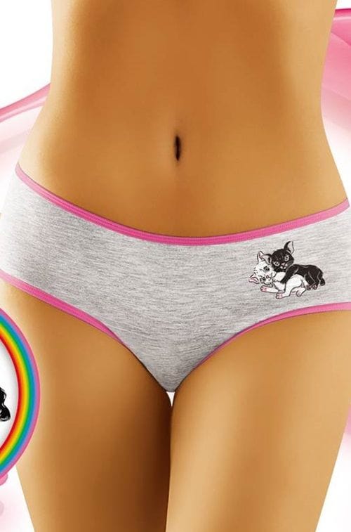 Słodkie, bawełniane figi z nadrukiem dwóch figlujących kociaków - białym i czarnym. Z tyłu, na pośladkach odbite kocie łapki... Całość w delikatnej, szarej barwie, z różową lamówką.