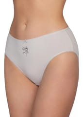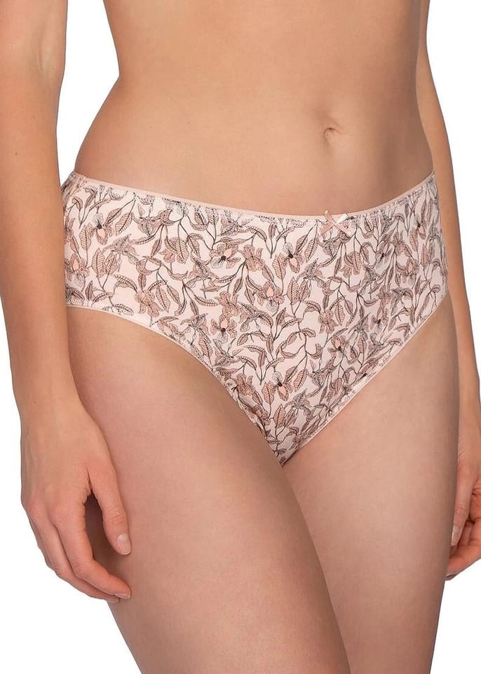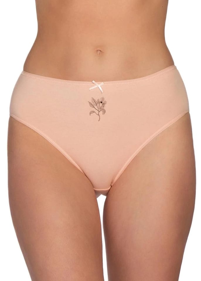 Bawełniane figi damskie o klasycznym kroju bikini z lekko zabudowanymi biodrami. W pasie płaska gumka z kokardką. Pakowane po 3 sztuki. Skład: 95% bawełna, 5% elastan.