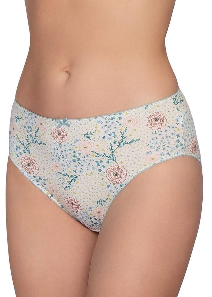 Bawełniane figi damskie o klasycznym kroju bikini z lekko zabudowanymi biodrami. W pasie płaska gumka z kokardką. Pakowane po 3 sztuki. Skład: 95% bawełna, 5% elastan