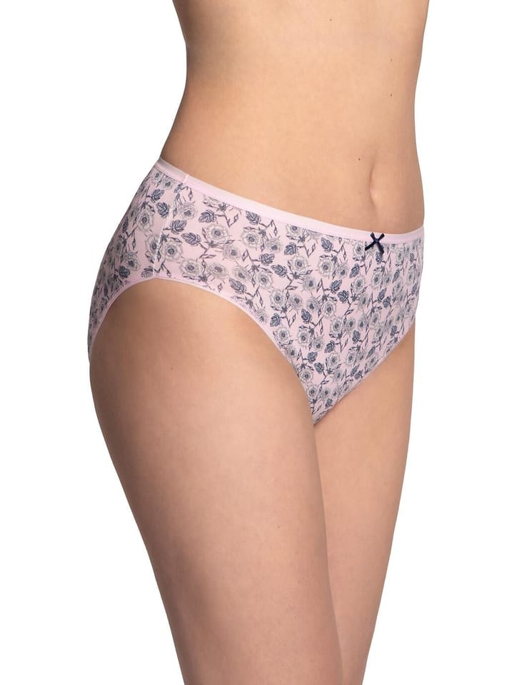 Bawełniane figi damskie o klasycznym kroju bikini i lekko zabudowanych biodrach .W pasie płaska gumka z kokardką. Pakowane po trzy sztuki.Skład: 95% bawełna, 5% elastan.