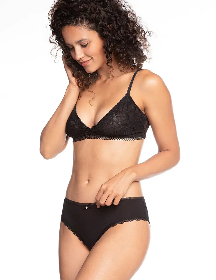 Bawełniane figi damskie o kroju bikini. W pasie elastyczna siateczka, tył nogawek wykończony ażurową koronką. Jedna sztuka wzorzysta, druga gładka. Pakowane w pudełko po dwie sztuki. Skład: 95% bawełna, 5% elastan.
