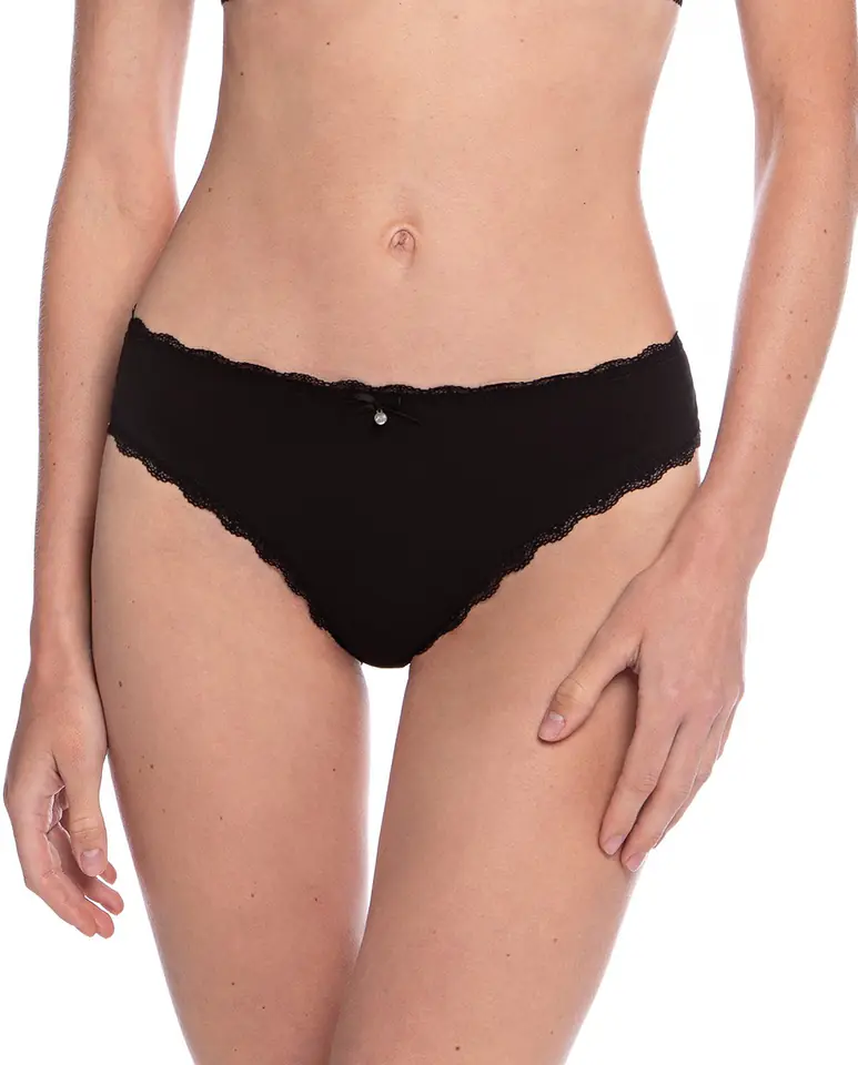 Bawełniane figi damskie o klasycznym kroju bikini. Obszyte koronkową tasiemką. Tył nogawek obszyty szerszą ażurową koronką. Pakowane w pudełko po dwie sztuki. Skład: 95% bawełna, 5% elastan.