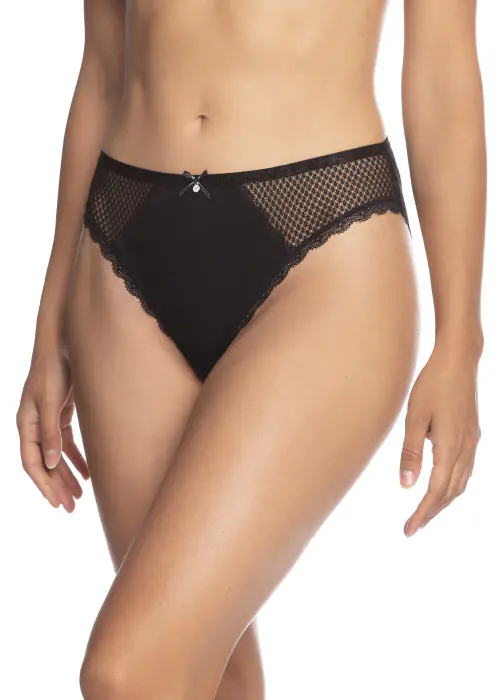 Eleganckie figi damskie o kroju bikini, wykonane z dzianiny wiskozowej. W opakowaniu jedna sztuka jednolita, druga ozdobiona wzorem w gwiazdki. Biodra i tył ozdobione ażurową koronką. Pakowane po dwie sztuki. Skład: 95% wiskoza, 5% elastan
