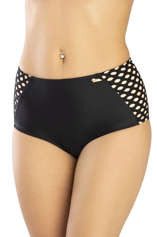 - Wygodne, kąpielowe majteczki z ażurowymi bokami, w czarno-beżowym kolorze. Wyższe, dzięki temu z pewnością poczujesz się w nich bardzo wygodnie. Przód na podszewce, tkanina włoska, szybkoschnąca. Skład: 80% poliamid, 20% elastan.