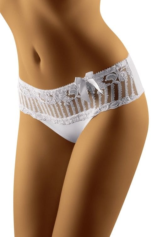 Subtelna gra haftowanych motywów z wygodnym, klasycznym krojem - figi Mela. Przód dzięki zastosowaniu piękniej, transparentnej koronki prezentuje się "lekko" i delikatnie. Tył gładki. Skład: 87% poliamid, 13% elastan.