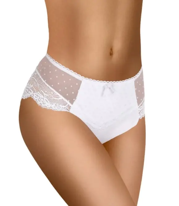 Figi damskie wykonane z wysokiej jakości efektownej koronki. Pas ozdobiony satynową kokardką. Tył koronkowy. Skład: 85% poliamid, 15% elastan.