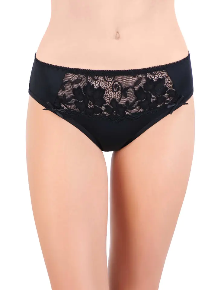Fig damskie, uszyte z delikatnej mikrofibry. Przód ozdobiony piekną koronkową wstawką i małymi kokardkami. Tył, gładki, jedolity. Materiał: 85% poliamid, 15% elastan.