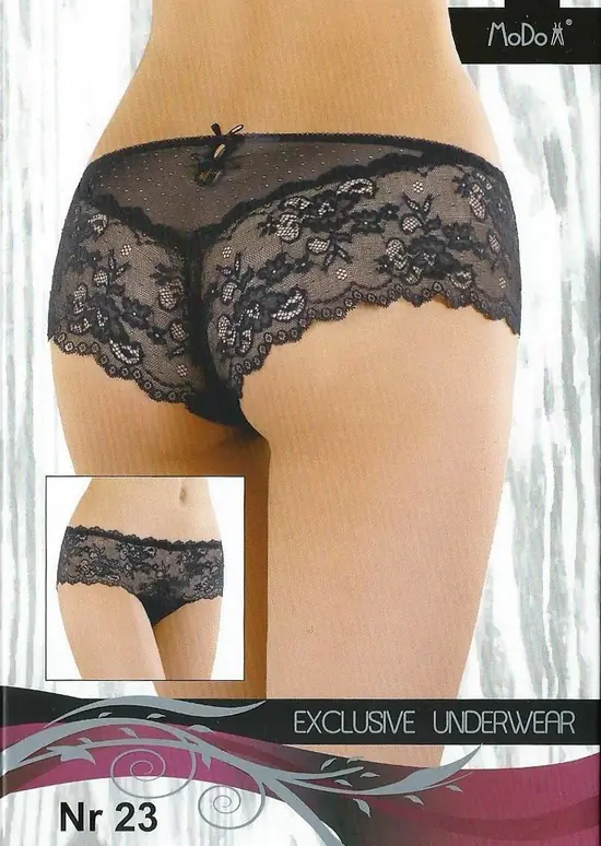 Figi z koronki o kwiatowym motywie, z tyłu efektowne rozcięcie ozdobione dwoma satynowymi kokardkami. Skład: 85% poliamid, 15% elastan.