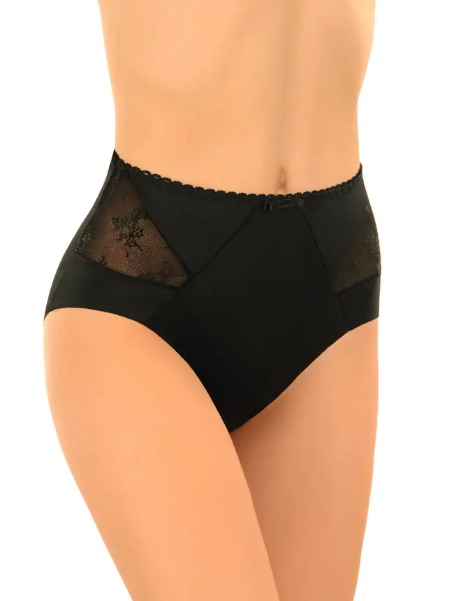 Figi damskie wysokie z delikatnej mikrofibry. Przód zdobią koronkowe wstawki. Nogawki cięte laserowo, nieodznaczające się pod ubraniem. Skład: 85% poliamid, 15% elastan.