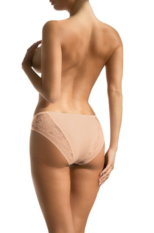 Beżowe figi wykończone piękną koronką w rejonie pośladków. Przód gładki. Miękka, elastyczna tkanina. Krój wygodny i kobiecy. Propozycja idealna na co dzień. Skład: 92% bawełna, 8% elastan.