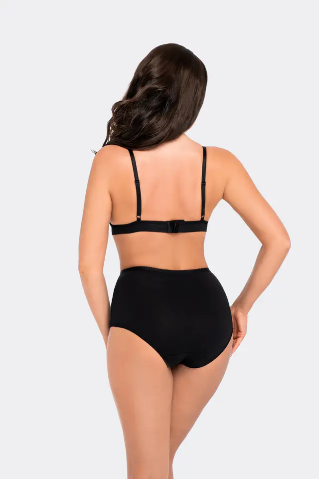 Bawełniane figi, wyższe w kroju. Model o profilujących cięciach, z koronkową wstawką po obu bokach. W pasie wygodna, elastyczna gumka. Skład: 92% bawełna, 8% elastan.