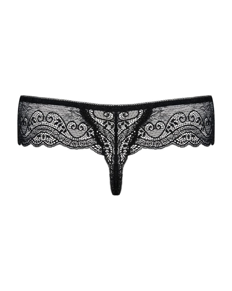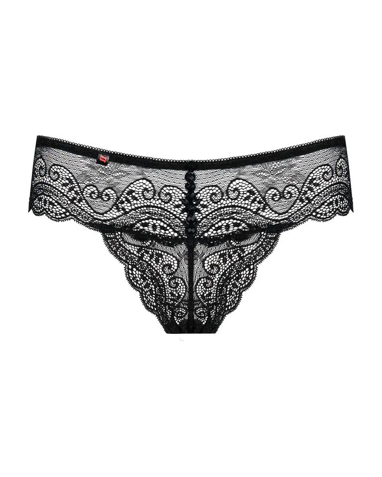 - eleganckie, koronkowe stringi- zdobienia przykuwają uwagę - rząd połyskujących kamyczków z przodu dodaje uroku- trójkątne przeszycia z tyłu podkreślają pośladki- delikatna koronka idealnie dopasowuje się do kształtów (90% poliamid, 10% elastan).