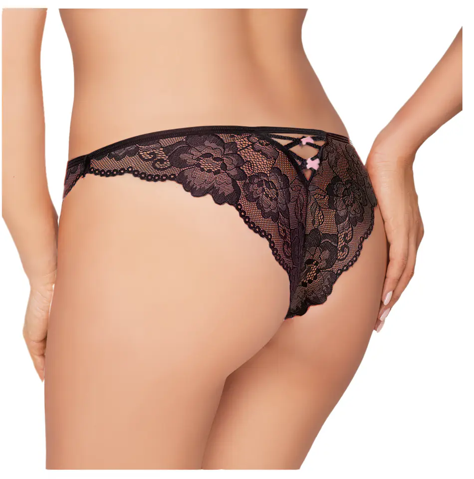 Koronkowe stringi z ozdobnymi kokardkami. Subtelne i delikatne. Fason nawiązuje do kroju brazylijskiego - jednego z obecnie najpopularniejszych. Skład: 89% poliamid, 11% elastan.