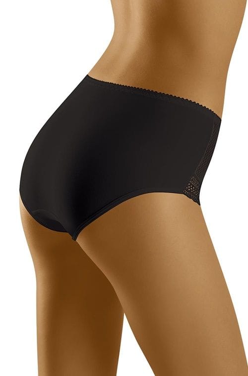 Wygodne figi, których przód zwieńczono ażurowym deseniem a'la kabaretka. Z gładkim tyłem. Fason klasyczny, nieco wyższy, lekko modeluje brzuszek. Okolice ud ładnie zdobione. Skład: 83% poliamid, 17% elastan.