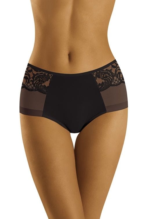 Piękne, kobiece figi wykonane z połączenia delikatnej siateczki, koronki i gładkiej mikrofibry. Fason nieco pełniejszy, zgrabnie się prezentuje. Skład: 83% poliamid, 17% elastan.