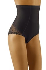 Wysokie figi zdobione koronką na pośladkach. Linia modelująca rejon brzucha i bioder. Przód i tył gładki, wykonany ze spcjalistycznej dzianiny, subtelnie wysmukla ciało i wpływa na poprawę kształtów ciała. Wyższy stan to także optyczne wyszczuplenie rejonu talii, góra od wewnątrz podszyta silikonem, zwiększa komfort noszenia bielizny i zabezpiecza ją przed zsuwaniem się z ciała. Skład: 58% poliamid, 42% elastan.
