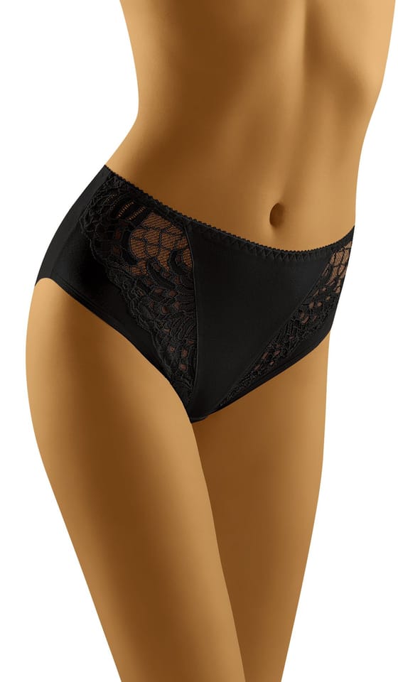 Figi pełne, zabudowane z wysokiej jakości bawełny ekologicznej z dodatkiem lycry, z przodu ozdobne koronkowe wstawki. Tył gładki.