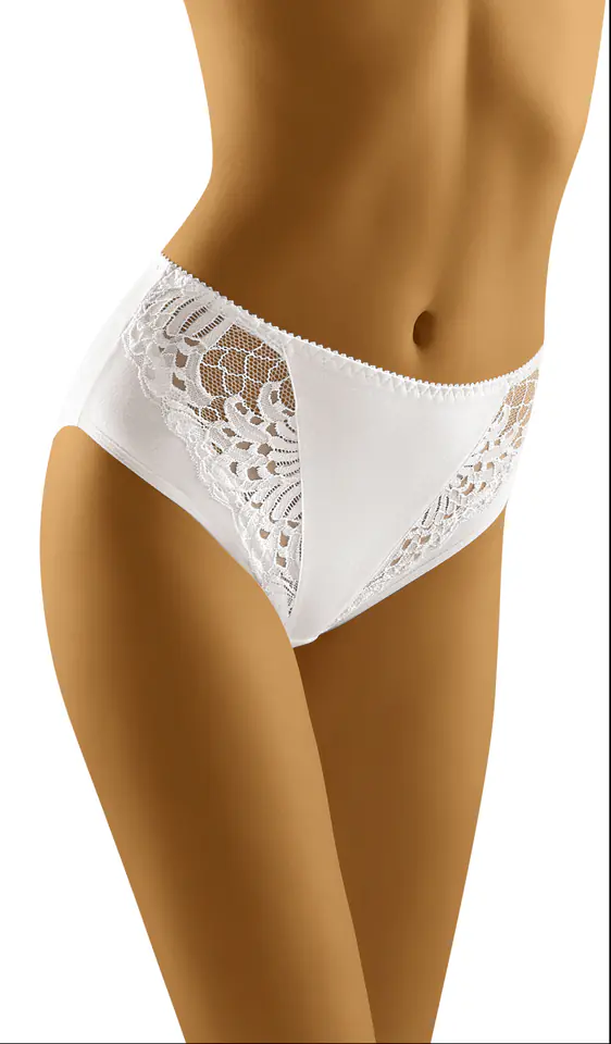 Figi pełne, zabudowane z wysokiej jakości bawełny ekologicznej z dodatkiem lycry, z przodu ozdobne koronkowe wstawki. Tył gładki.