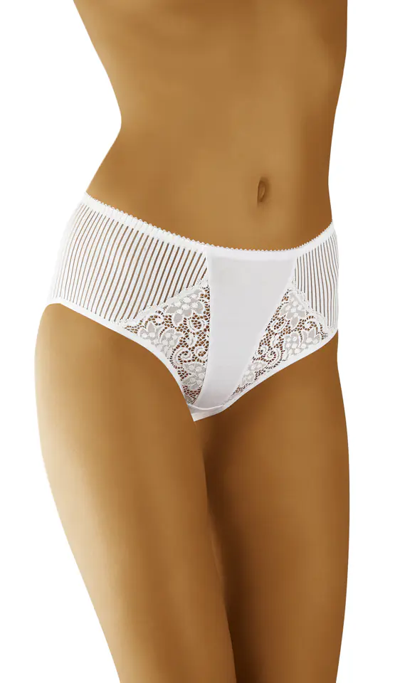 Figi pełne, zabudowane z wysokiej jakości bawełny ekologicznej z dodatkiem lycry. Przód wykonany z tkaniny w delikatny prążek, gładkiej bawełny i wstawek ażurowej koronki. Tył gładki.