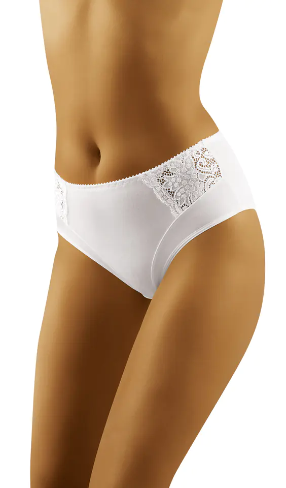 Figi pełne, zabudowane z wysokiej jakości bawełny ekologicznej z dodatkiem lycry, po bokach wstawki ażurowej koronki. Tył gładki.