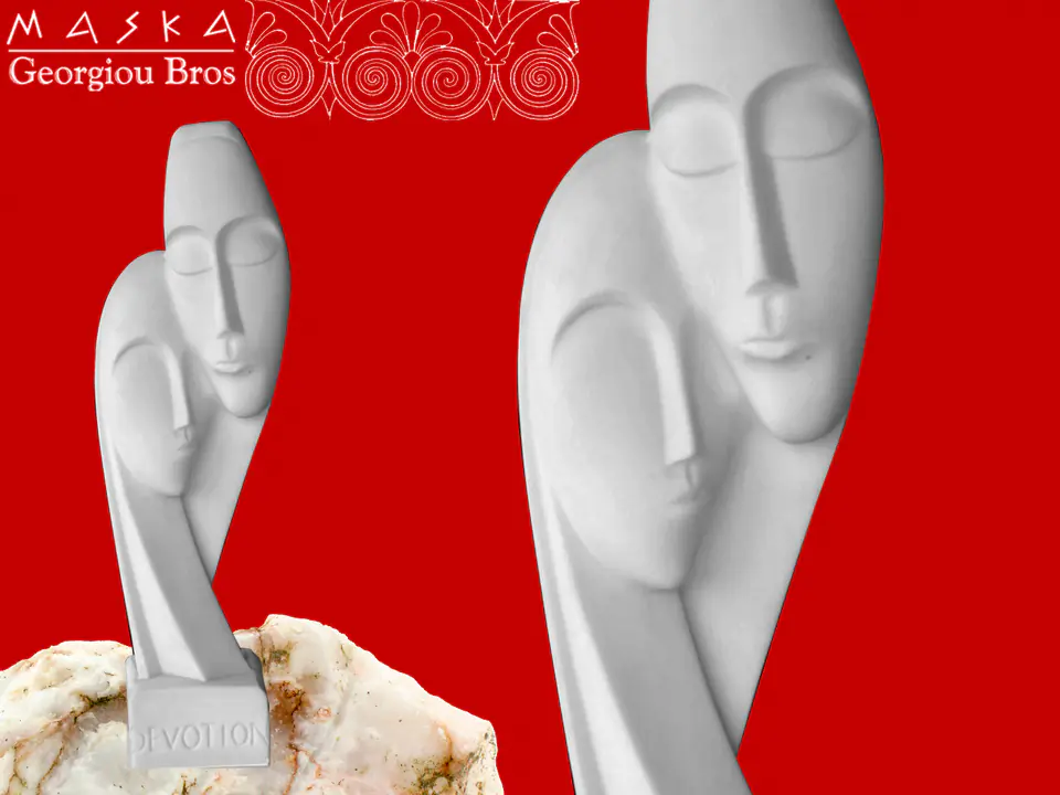Alabastrowa figurka przedstawiająca dwie maski. przytulone niczym para kochanków. Od czasów starożytnych alabaster był wysoko cenionym kamieniem ozdobnym i dekoracyjnym. Niezliczona ilość wzorów jest inspiracją do tworzenia własnych