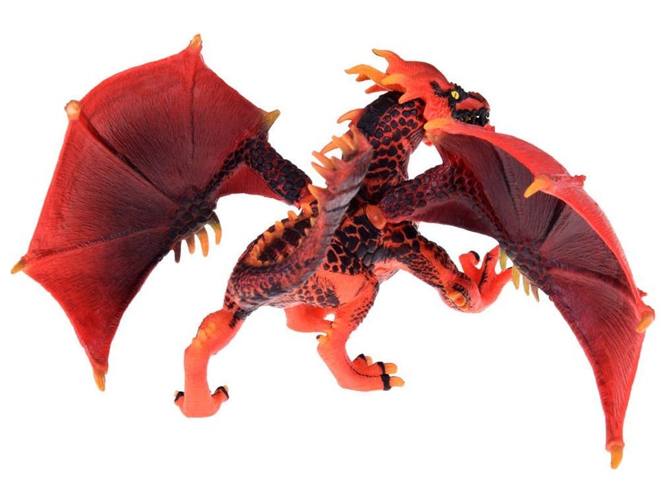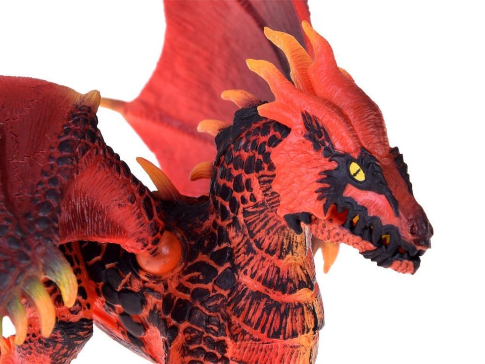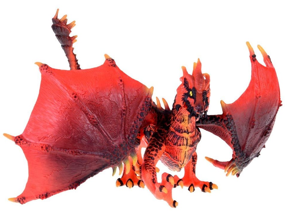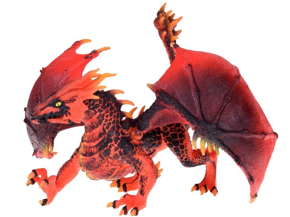 Majestatyczna Figurka czerwony Smok. Ta imponująca figurka przedstawia potężnego smoka z łuską w kolorach ognia, ostrymi pazurami i majestatycznymi, ruchomymi skrzydłami oraz ruchomą paszczą. Figurka jest starannie wykonana z najwyższej jakości materiałów i zachwyca realistycznymi detalami. Zapewni mnóstwo wspaniałej zabawy, tworzenia historii, opowieści.