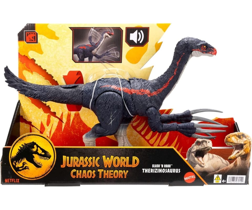 - Mięsożerny chaos! Figurka Therizinosaurus z Jurassic World jest dokładna pod względem treści, z elementami ataku i dźwięku.