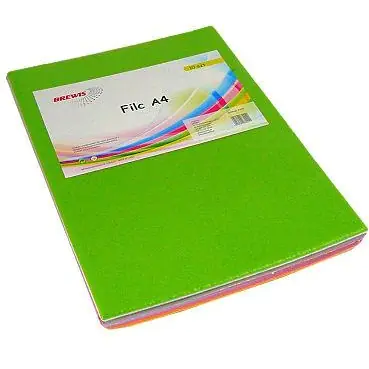 Filc dekoracyjny o grubości okolo 1,5 mm. W opakowaniu znajduje sie 10 arkuszy formatu ok. A4 (210x290mm) w kolorach: zóltym, pomaranczowym, rózowym, fioletowym, czerwonym, niebieskim, brązowym, czarnym, bialym i zielonym.