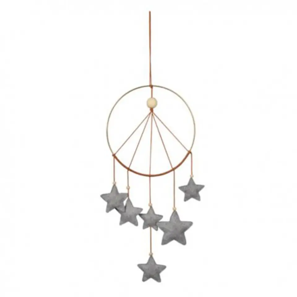 Filibabba Zawieszka Gwiazdki Grey melange Piękna zawieszka z gwiazdkami inspirowana indyjskim łapaczem snów. Pięknie ozdobi pokój dziecka, tworząc w nim przytulną atmosferę i aurę dobrych snów. Zawieś go nad łóżeczkiem, na ścianie lub w oknie. Wymiary: 21cm Materiał: filc, poliester FI-SNMG003